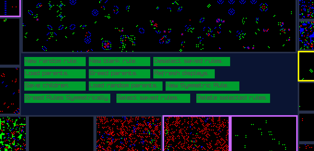 This tool allows you to generate random, blank, or symmetric 4-state 2D cellular automata and breed them together using a mixture of sexual reproduction and random mutations. All actions are given by buttons in the middle and operate on the selected rules which are highlighted in purple. You can toggle the selection of a rule by left clicking it.